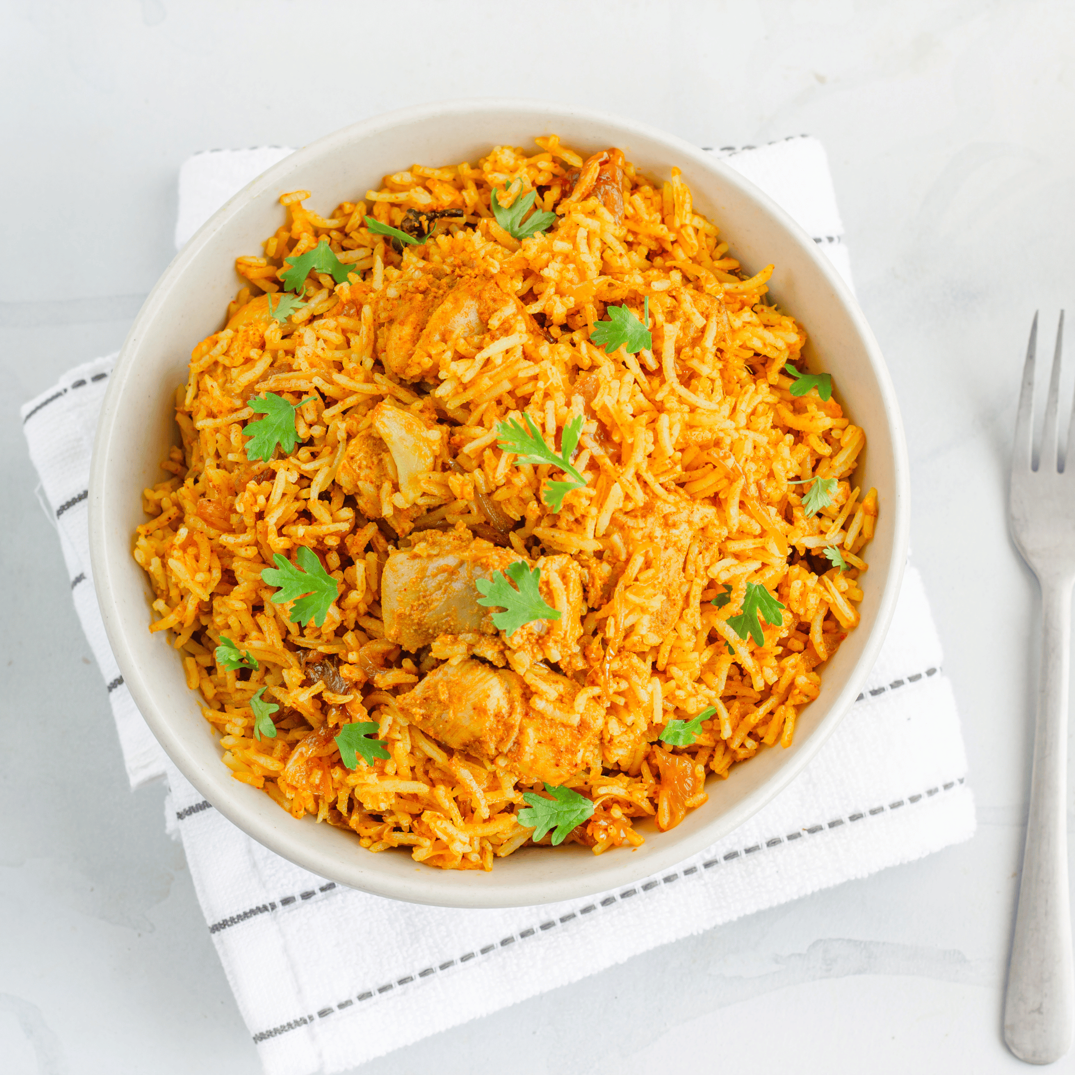 Tender chunks of chicken cooked in a spicy blend of onion, garlic, tomatoes, yogurt, and spices mixed with steamed basmati rice.