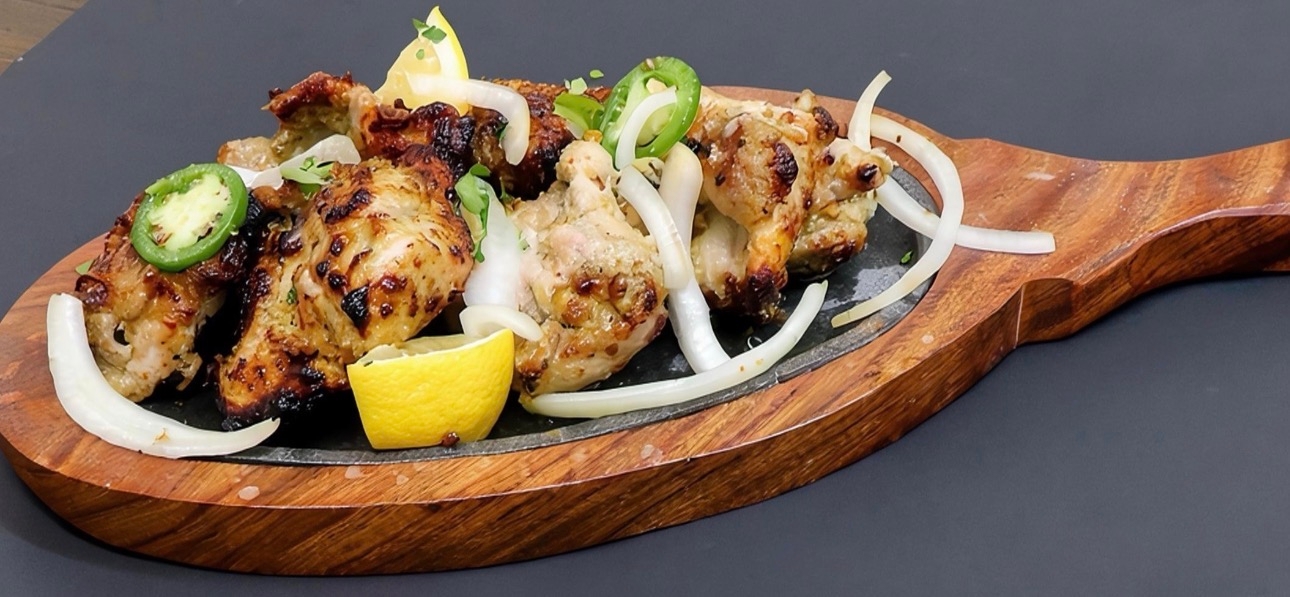 Boneless chicken breast marinated overnight in a blend of yogurt, spices and masala cooked on flat grill